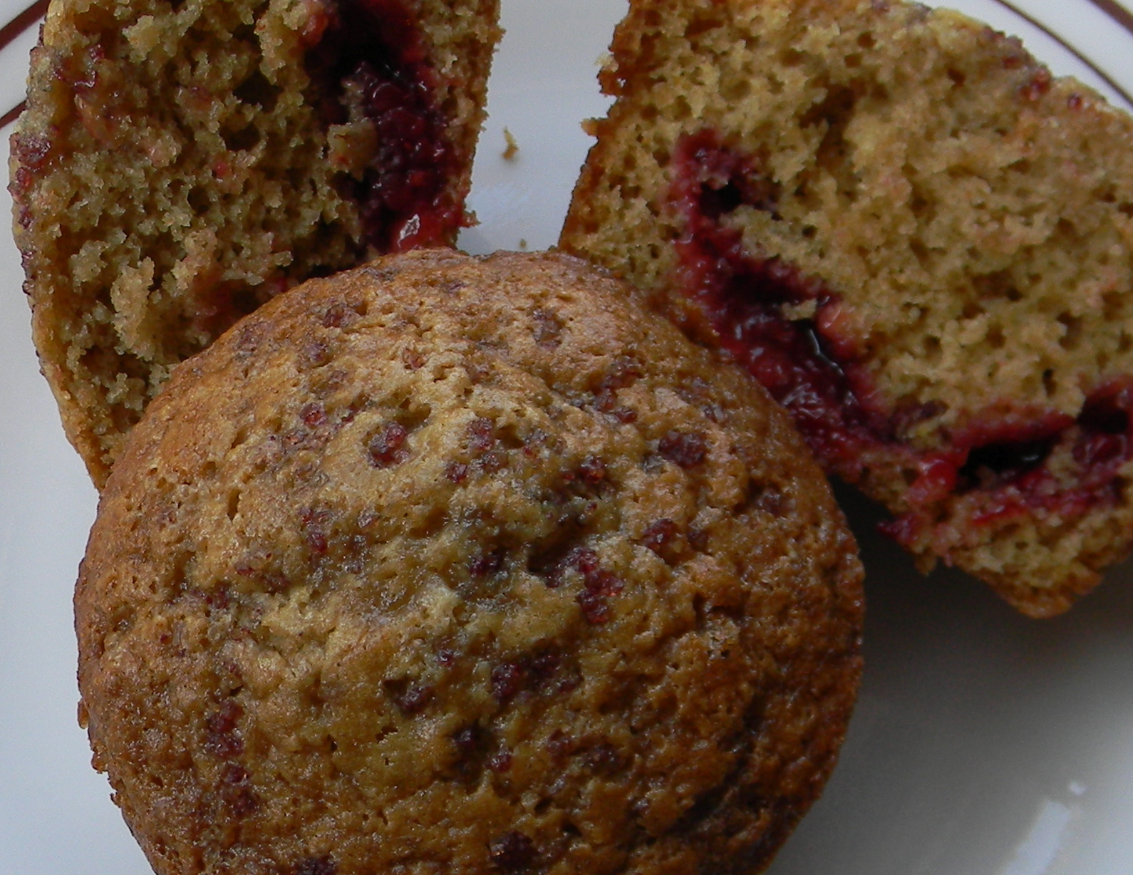 *After scooping about a tablespoon of batter into each muffin space (using half the batter), I placed a scant tablespoon (or a heaping teaspoon?)of Raspberry Pie Filling on each. Then topped each with the rest of the batter.